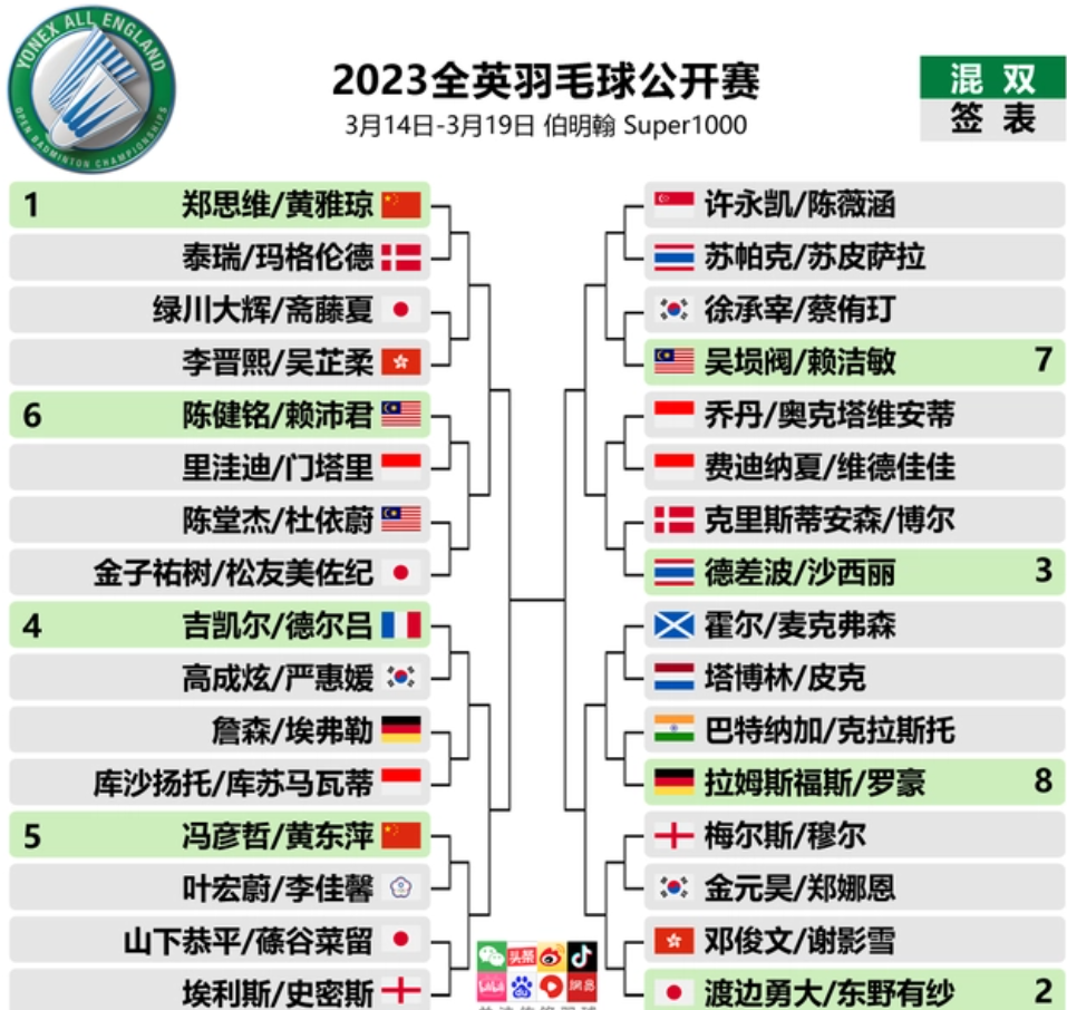 国羽具体参赛名单是女单:陈雨菲、何冰娇、王祉怡、韩悦(福建)、张艺曼;男单:陆光祖、赵俊鹏、石宇奇、李诗沣、翁泓阳(福建);男双:刘雨辰/欧烜屹(福建)、梁伟铿/王昶、何济霆(福建)/周昊东、任翔宇/谭强;女双:陈清晨/贾一凡、张殊贤/郑雨、刘玄炫/李汶妹;混双:郑思维/黄雅琼、冯彦哲/黄东萍(福建) 。 TV8文体频道 ,赞 5 2月19日,黄东萍、何济霆助力国羽获得2023年亚洲羽毛球混合团体赛冠军 来自福建的选手有5名,分别是黄东萍、韩悦、欧烜屹、何济霆和翁泓阳。根据签表显示,作为赛会五号种子,冯彦哲/黄东萍首轮对手是中国台北选手叶宏蔚/李佳馨,他们晋级四强的最大对手是法国组合吉凯尔/德尔吕,如果能够跨越这一关卡,就有机会与赛会头号种子“雅思”组合在半决赛会师。